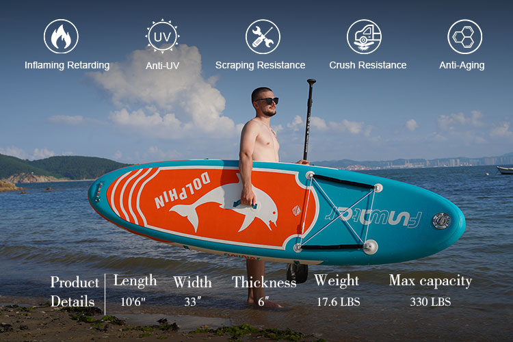 Water sports rely on the wide ocean, and this paddleboard with the dolphin icon calls on everyone to: feel the fun that nature brings us and cherish the marine ecology.